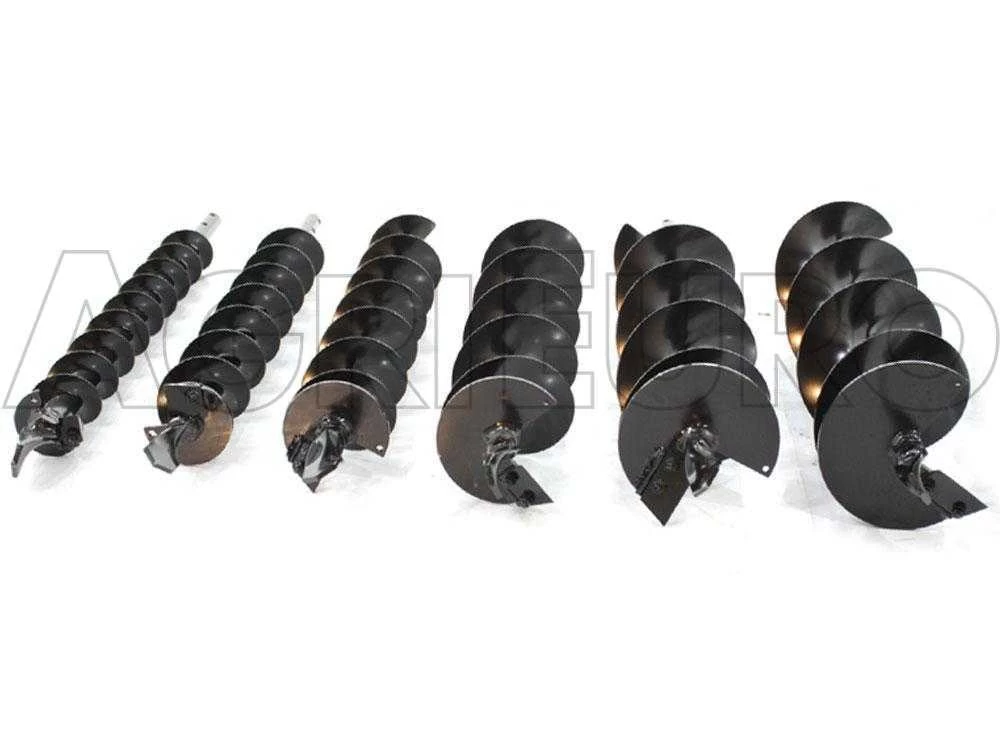 Disponibili vari tipi di punte, da 8 cm a 20 cm di diametro, e una prolunga per le punte, indispensabile per aumentare la profondità di perforazione.